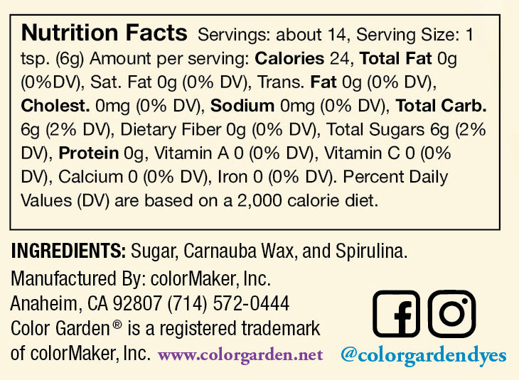 Color Garden® naturally colored sugar crystals are colored with pure natural food color. They come in 3 oz. bottles with an easy dispensing shaker top.
