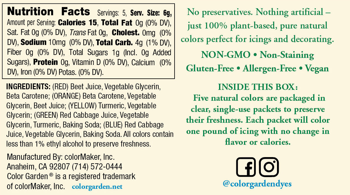 Color Garden® pure natural food colors bring fun and creativity back to baking without the worry that comes with using synthetic dyes. They can be used right out of the box to naturally color icings, butter cream, sanding sugar, or even batters when baking (see Instructions & Tips page).