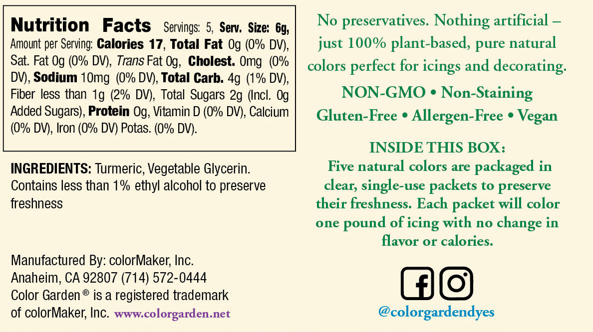 Color Garden® pure natural food colors bring fun and creativity back to baking without the worry that comes with using synthetic dyes. They can be used right out of the box to naturally color icings, butter cream, sanding sugar, or even batters when baking (see Instructions & Tips page).
