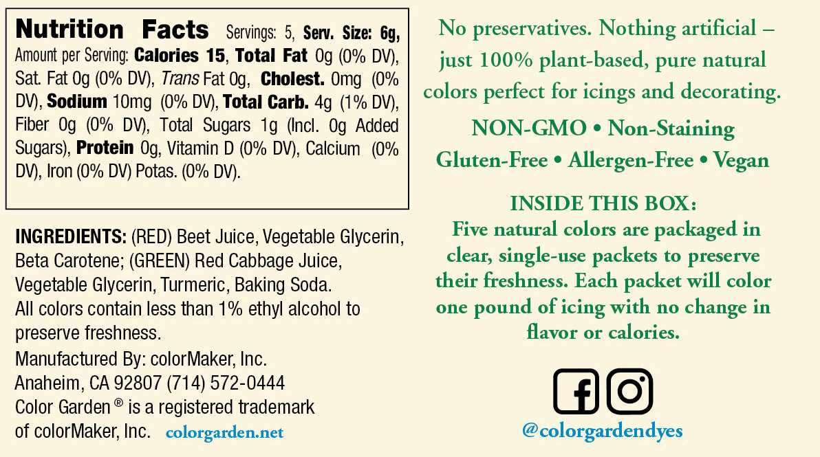 A free-standing floor display containing 90 pieces of Holiday-themed Color Garden products. Contains: 48 Boxes of Holiday Color, 9 bottles of Natural Colored Red Sugar, 9 Bottles of Natural Colored Green Sugar, 24 packs of Holiday themed baking cups (32 ct.)